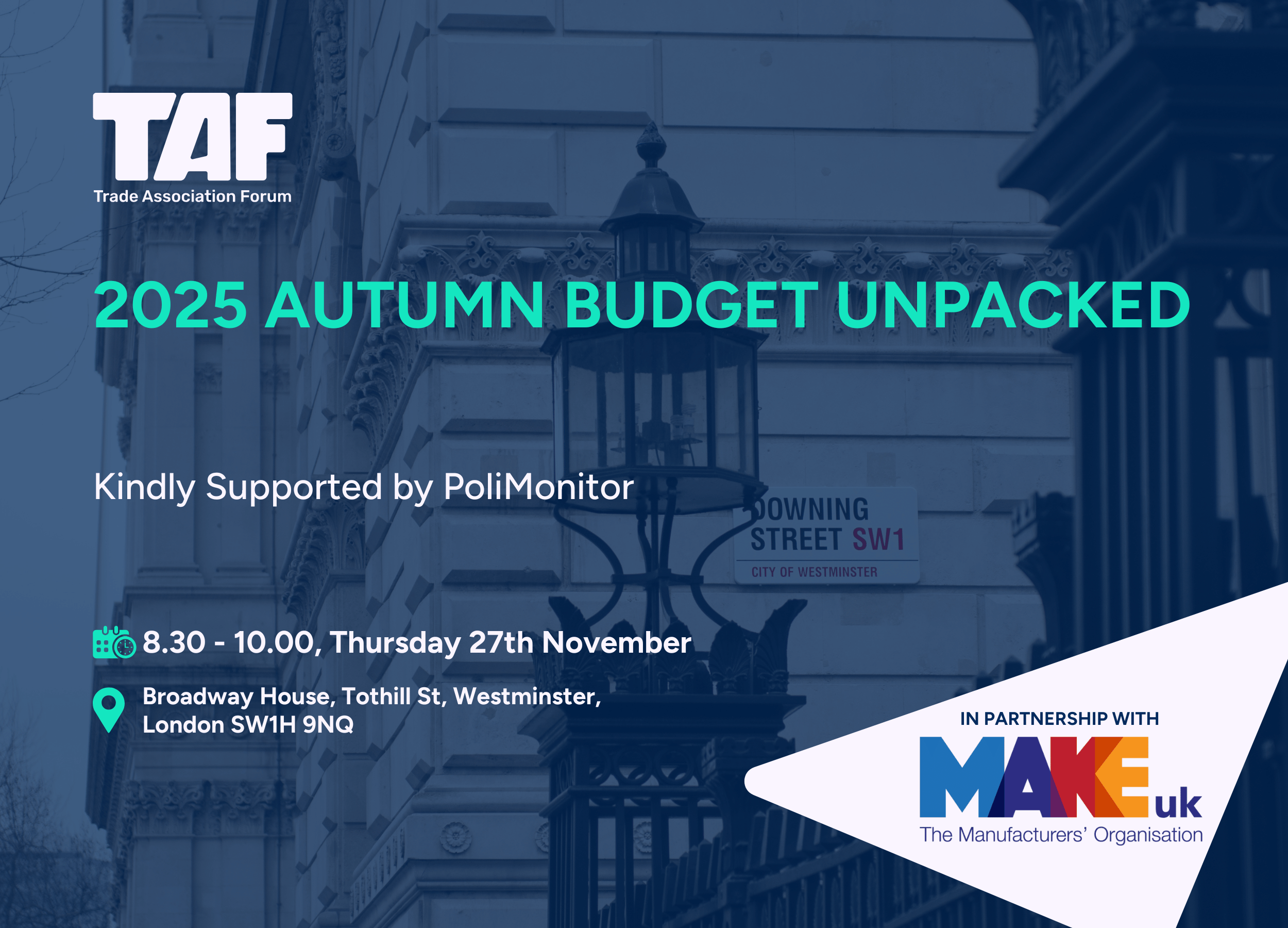 Join TAF and Make UK the morning after the Autumn Budget to hear from policy experts, economists, and association leaders as they unpack the key announcements. The session will provide timely analysis, and explore what this year’s Budget means for different sectors.